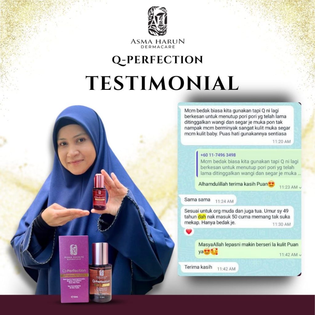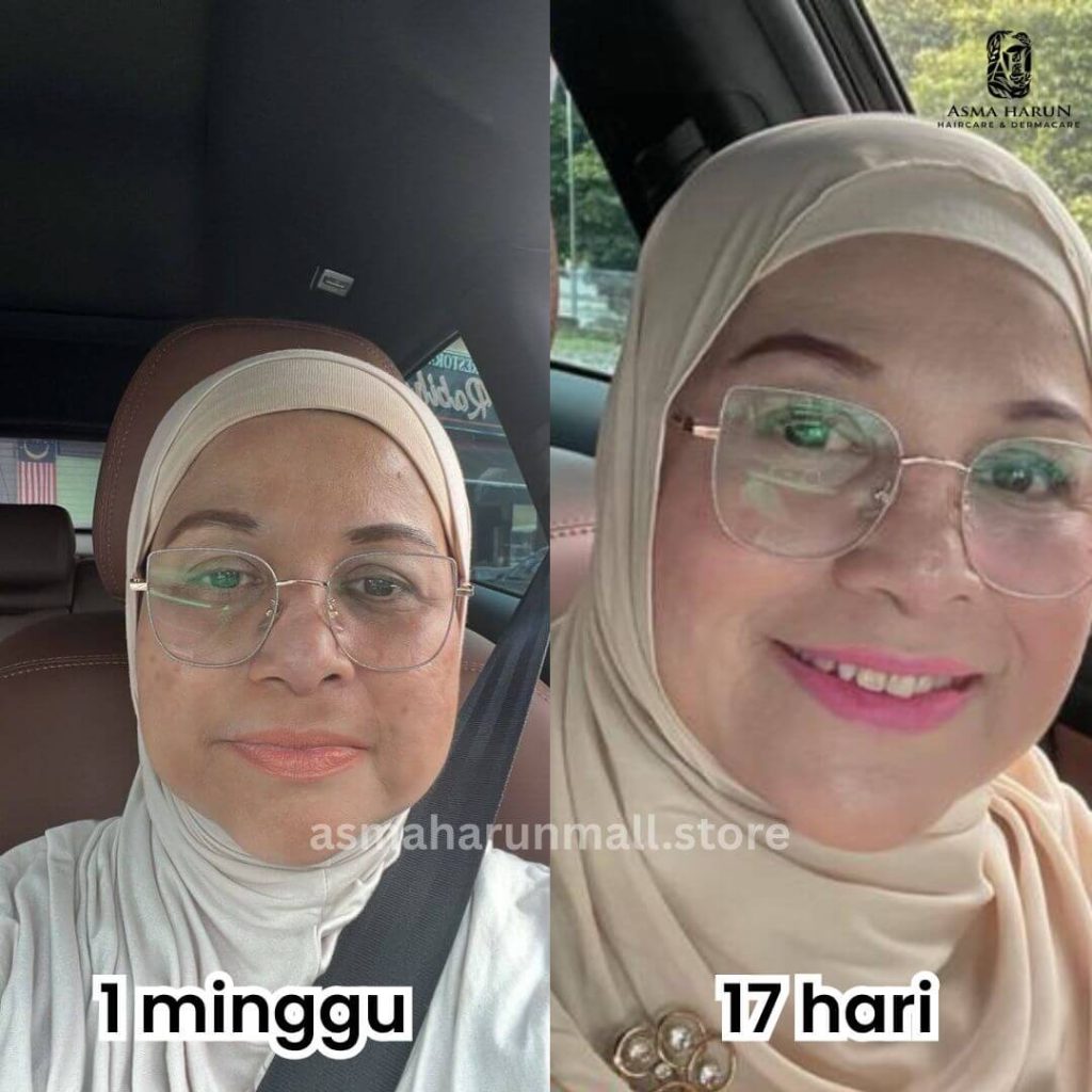 Jeragat di pipi dah berkurang sejak guna produk ustazah. Kulit makin cerah dan glowing. -Kak Emma, 55 Tahun.
