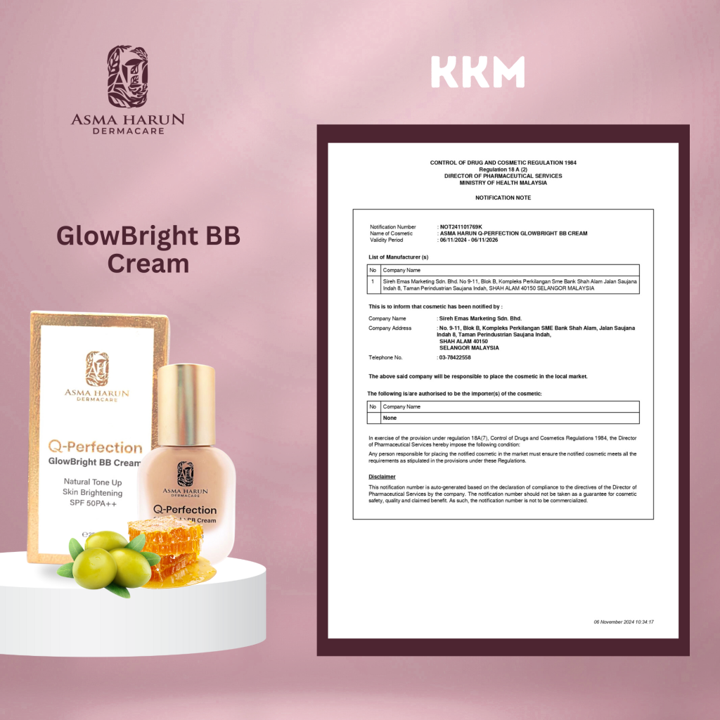 Ya, semua produk Asma Harun Dermacare diperbuat di kilang bertaraf GMP, dan berdaftar dengan Kementerian Kesihatan Malaysia (KKM).